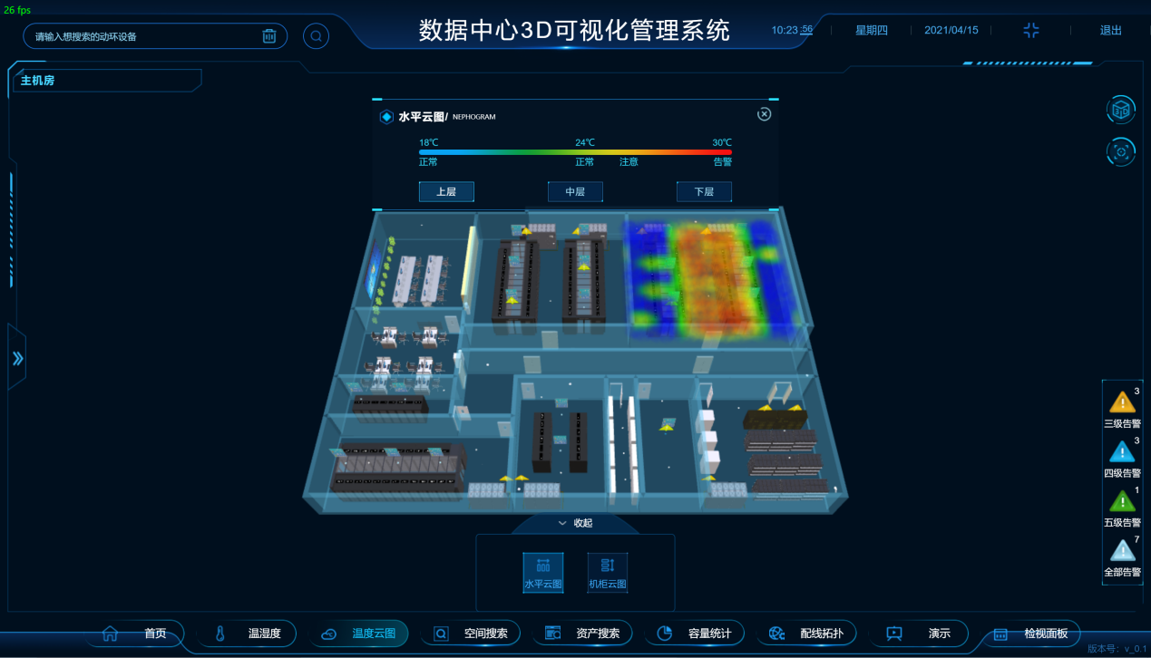 数据中心3D可视化管理系统可将数据中心机房内分散的多种专业监控系统融合在虚拟仿真环境中,建立统一监控管理,改变监控数据孤岛现象。通过三维场景展示数据和交互。大大提升数据交互效率和管理水平。实现监控价值最大化。