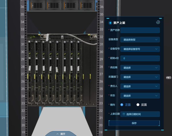 设备上下架可视化:支持资产的维护操作,可以实现设备的上下架操作。用户在3D场景中可以进行拖拽,直观实现设备上下架记录。