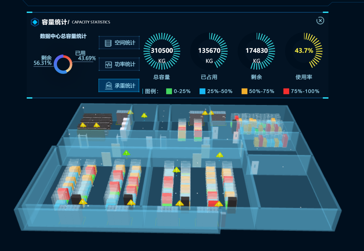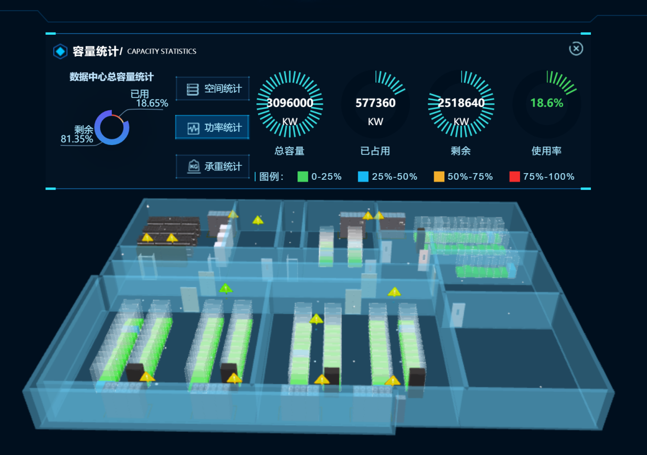机柜容量统计可视化:在3D可视化环境中支持机房机柜空间容量统计及分布统计,能根据不同颜色区分相关机柜的U位使用情况,如已经使用的U位与剩余的U位;支持对机房机柜空间分布图的可视化渲染表现。