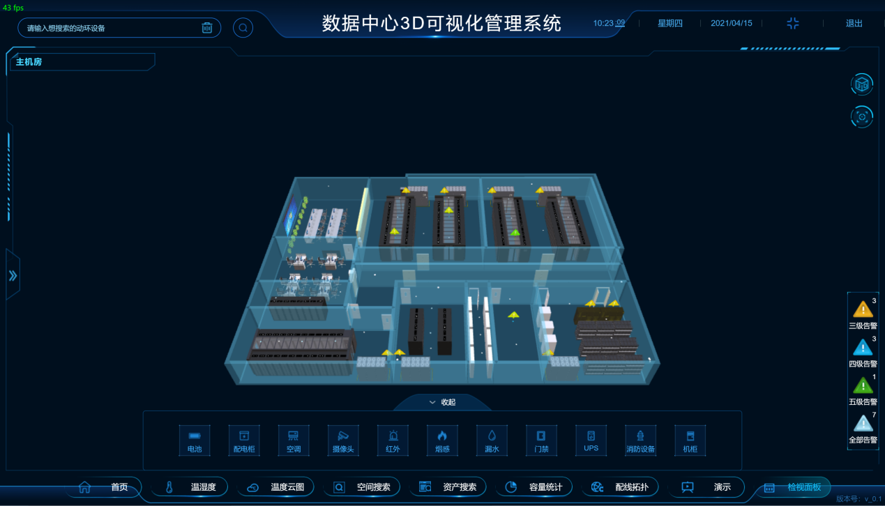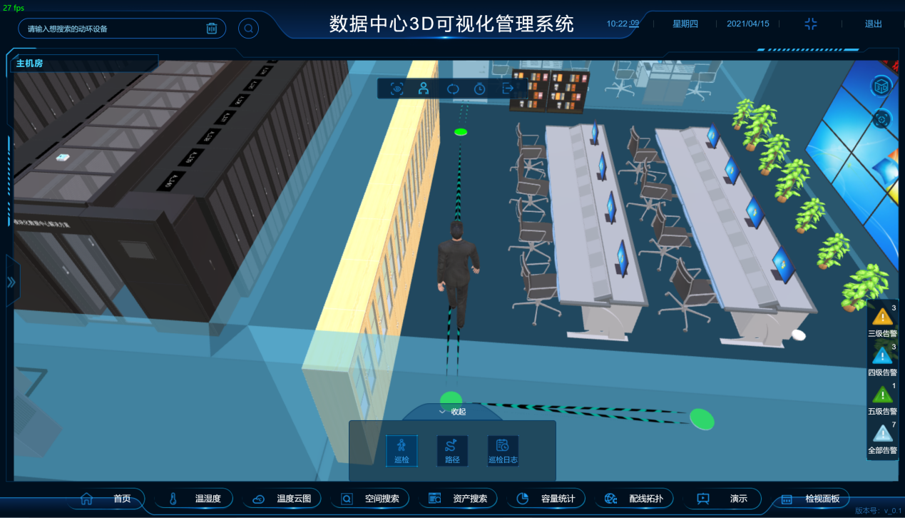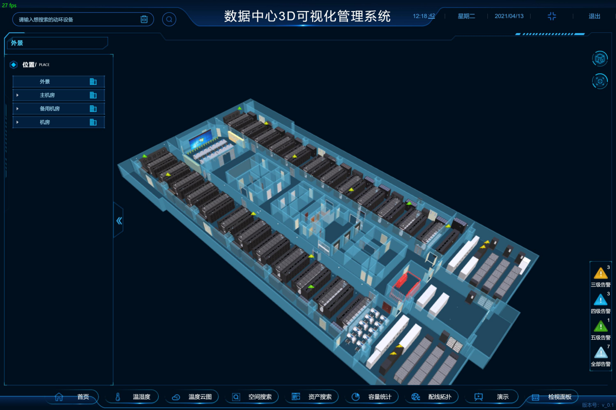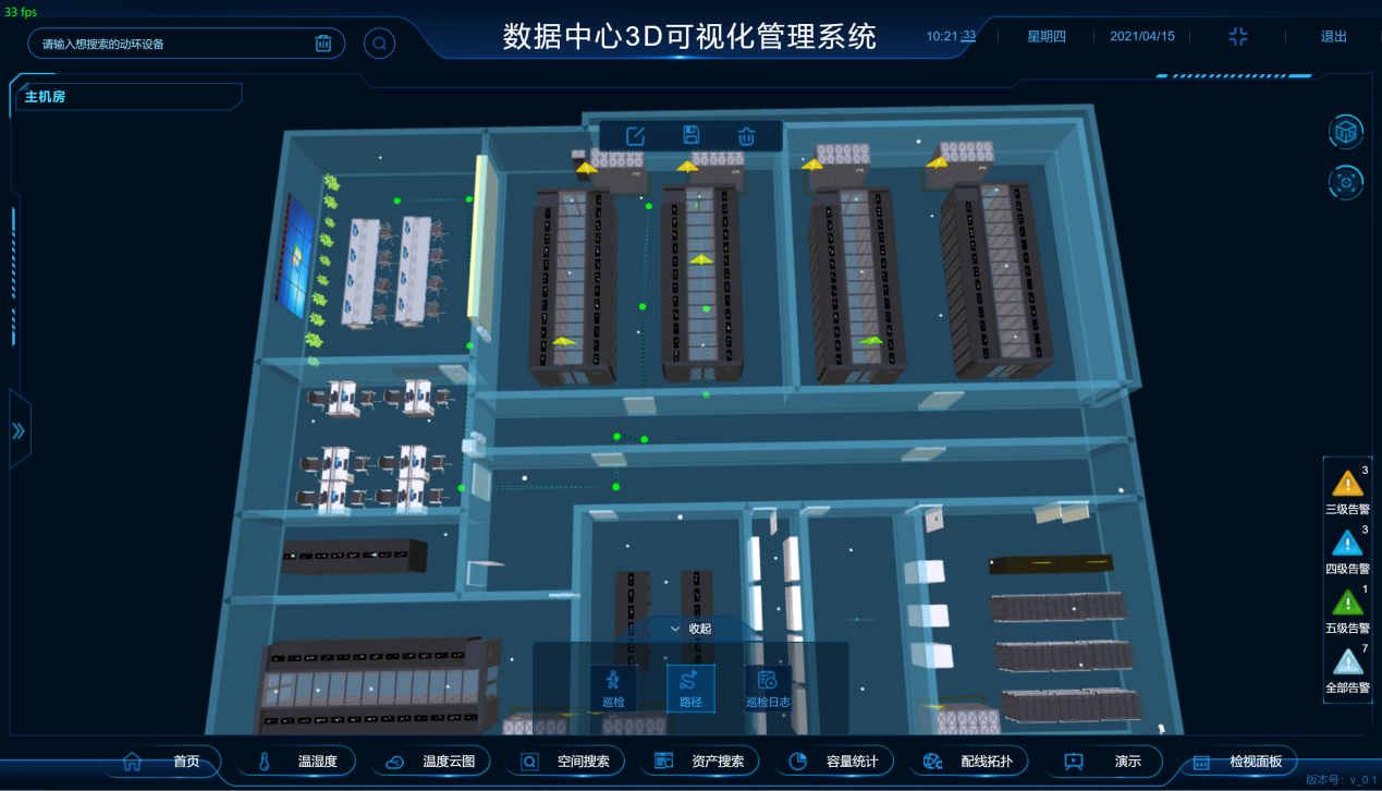 数据中心3D可视化管理系统:主要包含视频监控可视化、环境安全可视化、能耗消耗可视化、资产管理可视化、容量展现可视化、管线走向可视化、可以把各种监控数据融为一体,形成了多功能、高效率的可视化统一管理平台。