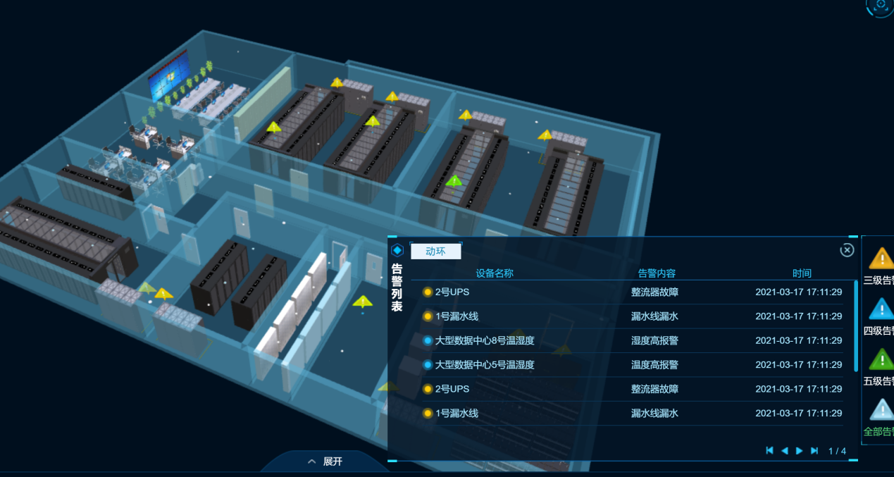 设备统一告警展示:集成各类监控系统里面的机房设备告警信息,在可视化环境中展示机房设备的所有告警信息。主要展示告警设备类型分为两类:独立设备告警,直接在此设备上出现告警图标和设备变色提示;机柜设备出现告警,在所属机柜上出现告警图标和机柜变色提示。